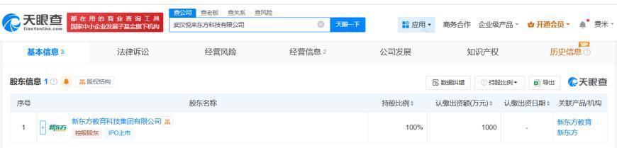 天眼查App显示,近日,武汉悦来东方科技有限公司成立,法定代表人为张腾飞,注册资本1000万人民币,经营范围包括信息技术咨询服务、计算机系统服务、软件开发、软件销售、组织文化艺术交流活动、会议及展览服务等,由新东方教育科技集团有限公司全资持股。